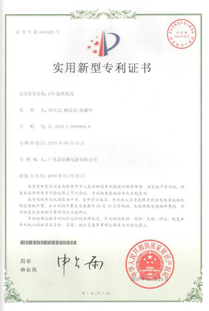 專利證書(UPS散熱裝置)