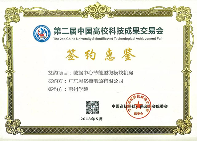 廣東恩億梯電源有限公司,作為業界領先的專業電力設備制造商,國家高新技術企業,創新型高端電源的倡導者,應邀出席了本次交易會。在為期三天的會展中,恩億梯項目團隊經多方甄選洽談、科學論證,成功與惠州學院數學與大數據學院攜手聯盟,簽約《節能型數據中心微模塊機房》技術合作項目。雙方高度順應信息化高速發展的時代,重點研究數據中心機房如何利用各種綠色節能技術降低PUE,降低客戶運營成本,提升數據機房能源利用率等技術合作及產品創新方案,更好地為金融、通信、政府、企業等數據中心建設服務。