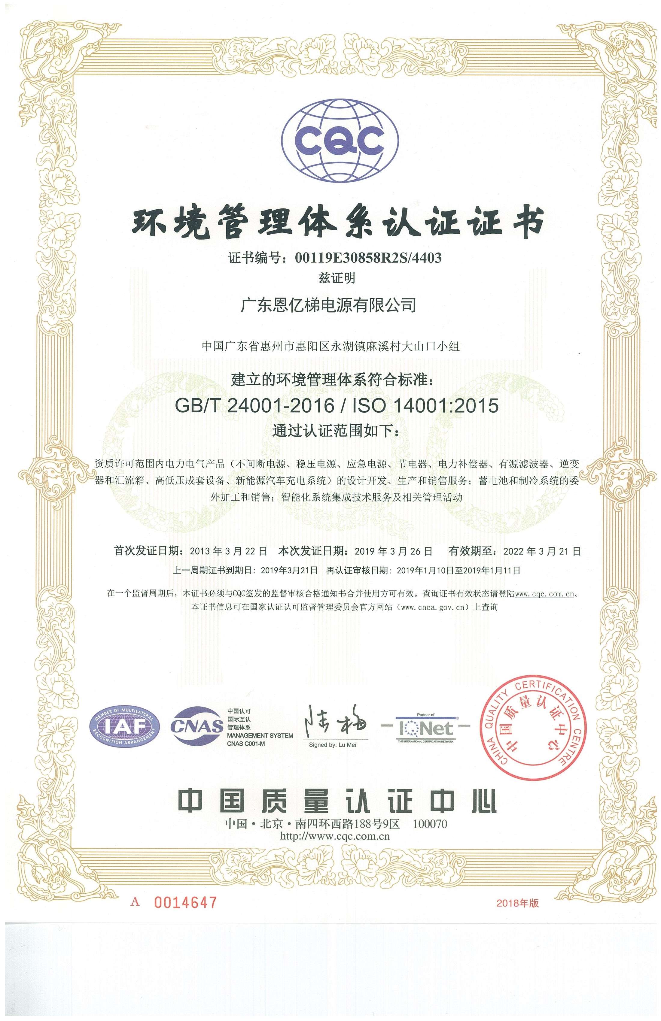 ISO14001環(huán)境管理體系認(rèn)證證書